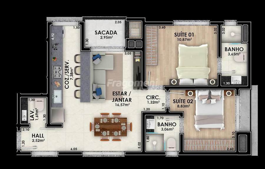 Apartamento com 02 dormitórios, sendo 01 suíte, perfeito para quem busca conforto e praticidade. O imóvel conta com sala de jantar, cozinha, área de serviço, lavabo e sacada com churrasqueira, ideal para momentos de lazer com família e amigos.