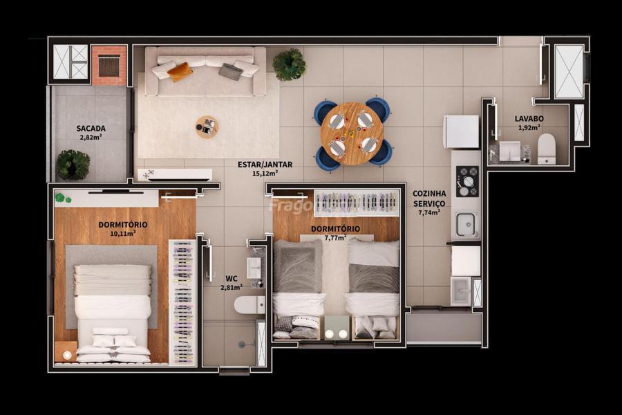 Apartamento composto por 02 dormitórios, sendo 01 suite, banheiro social, sacada com churrasqueira, uma vaga de garagem e ótima iluminação natural.