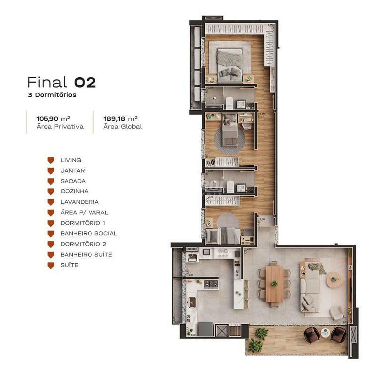 Área Global: 189,18m² | Área Privativa: 105,96m²