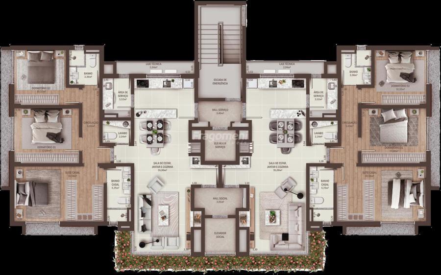 Apartamentos de 03 dormitórios, sendo 01 suíte, lavabo, sala de estar e jantar, cozinha americana, área de serviços separada, laje técnica, banheiro social e 02 vagas de garagem.