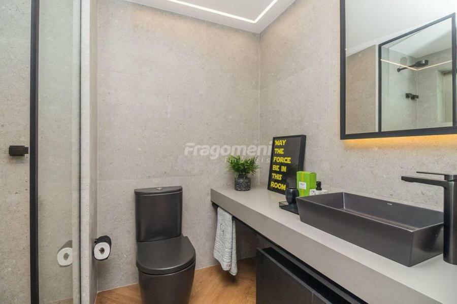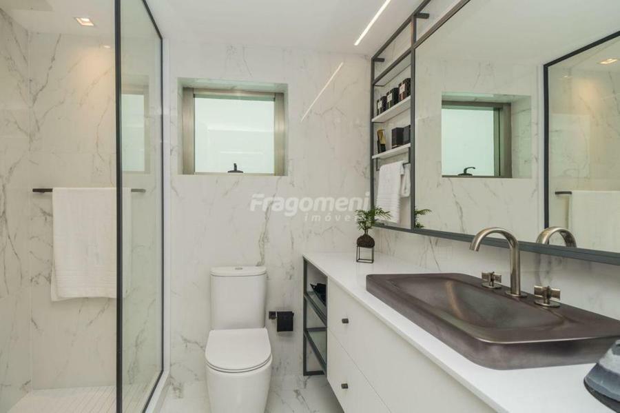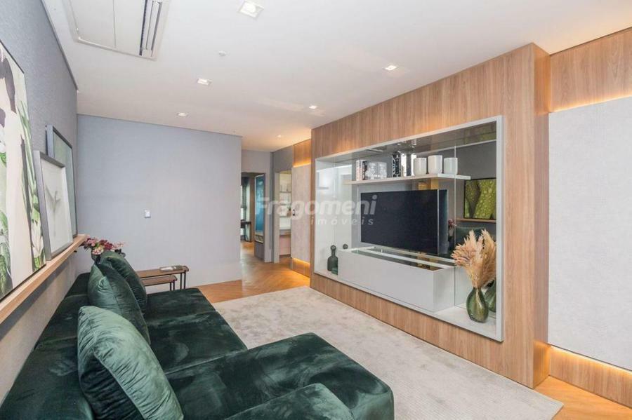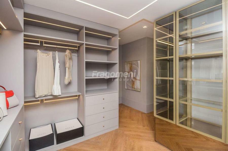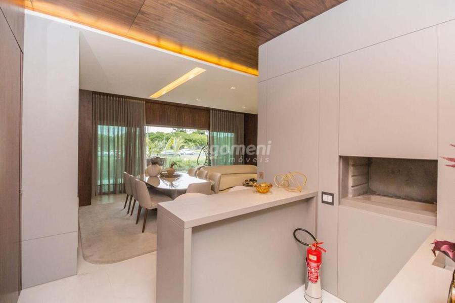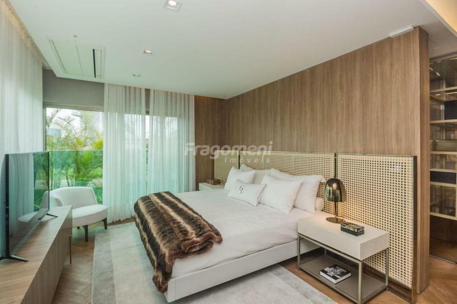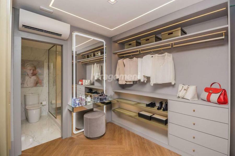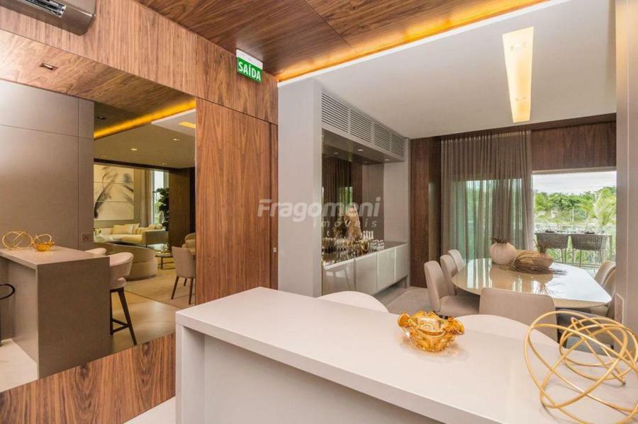 A sala de estar, com lareira, é composta por três ambientes, e um dos trunfos do apartamento é seu espaço gourmet projetado junto à sala de jantar e à cozinha, integrando e intermediando esses ambientes. Área íntima com family room e mais quatro suítes, sendo a master com closet e banheiros individualizados para o Sr. e a Sra.