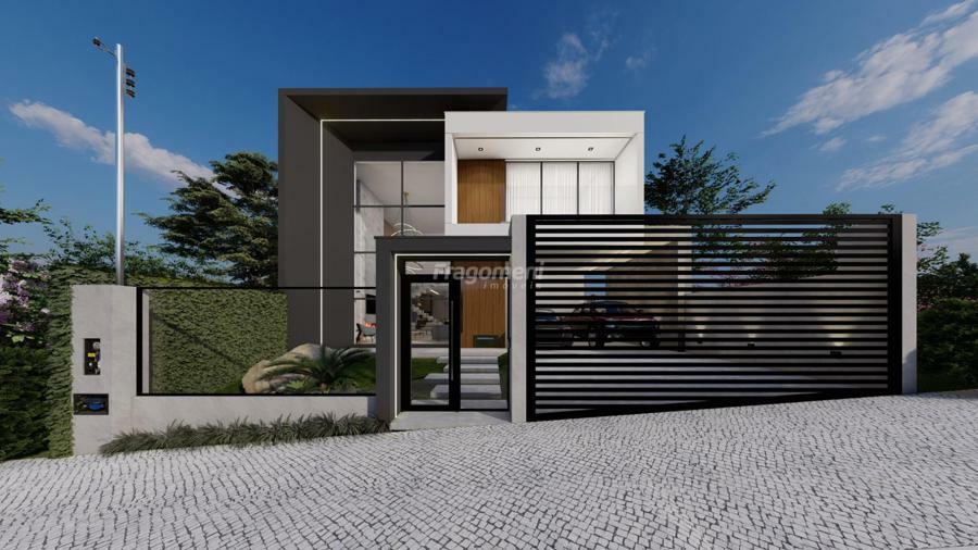 A imponência desta casa é transmitida por suas linhas retas e volumetria marcante. Os detalhes em led e os