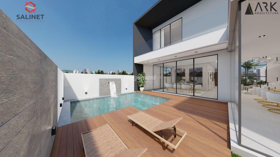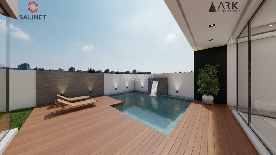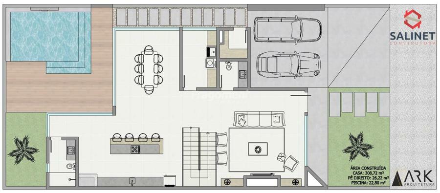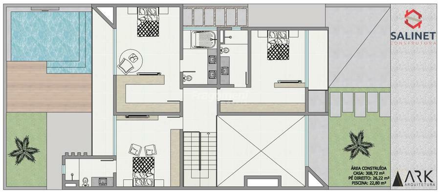 porcelanato 90 x 90 área social, laminado área íntima, paisagismo, piscina em blocos de concreto com