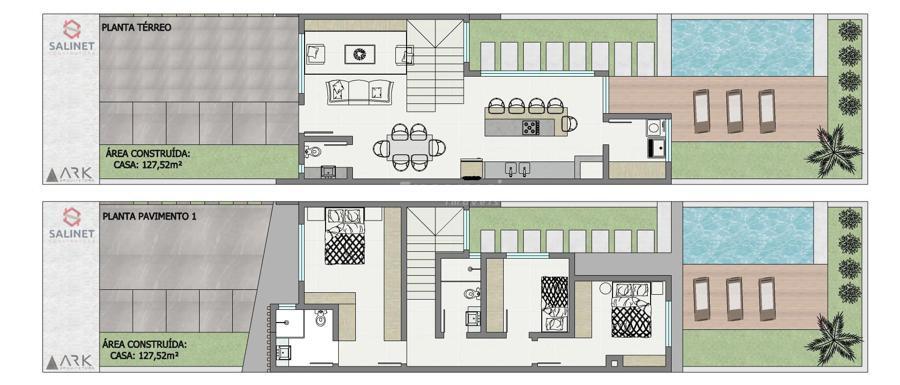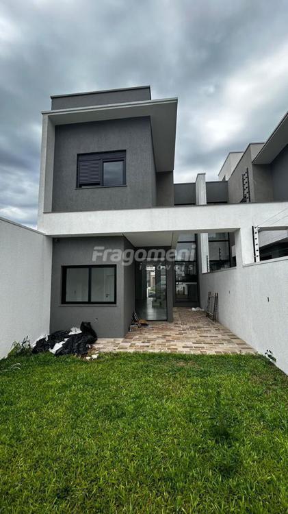 BAIRRO CIDADE NOVA - PASSO FUNDO/RS Dois belos sobrados geminados com estilo contemporâneo, onde o contraste das cores e dos volumes realçam a sua elegância. A fachada proporciona mais privacidade e os ambientes integrados com grandes aberturas que oferecem ótima iluminação natural e ventilação, além de conectar com a incrível área externa que possui um amplo espaço com deck, piscina e cascatas. Possui ainda, 03 dormitórios sendo 01 suíte, living integrado com amplos ambientes - sala de estar, sala de jantar, cozinha gourmet com churrasqueira, lavabo, garagem, lavanderia e jardim. Acabamentos: Aberturas externas em alumínio, aberturas internas laqueadas, pintura com textura grafiato, porcelanato 90 x 90 área social, laminado área íntima, paisagismo, piscina em blocos de concreto com revestimento vinil. Execução fiel ao render.
