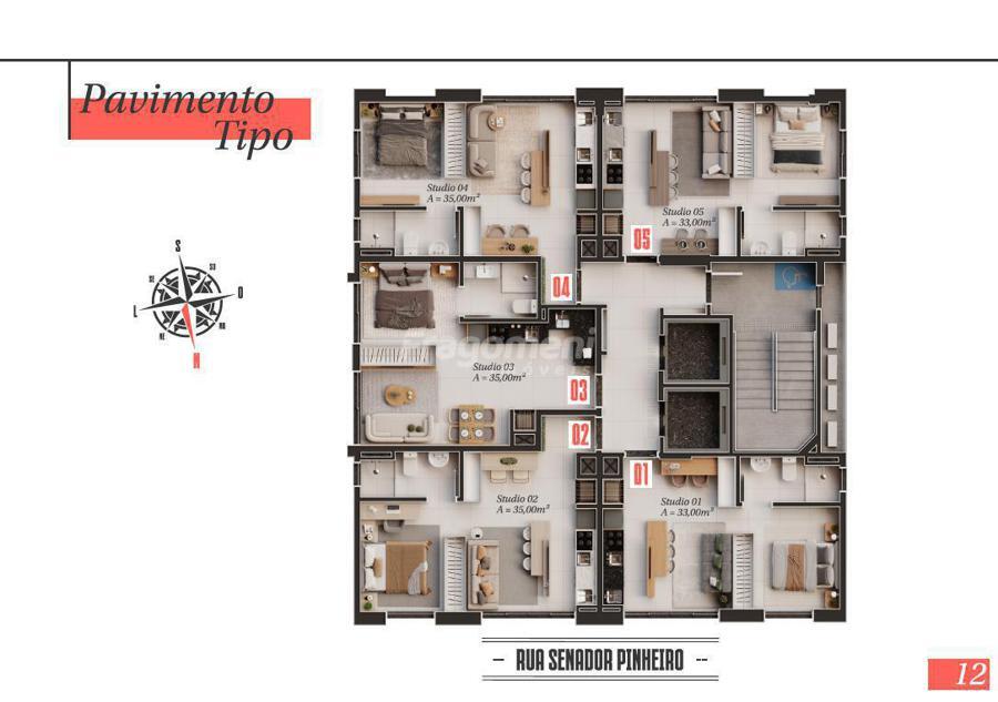 Serão 19 pavimentos e 5 apartamentos por andar de studios de 33 ou 35m² privativos.